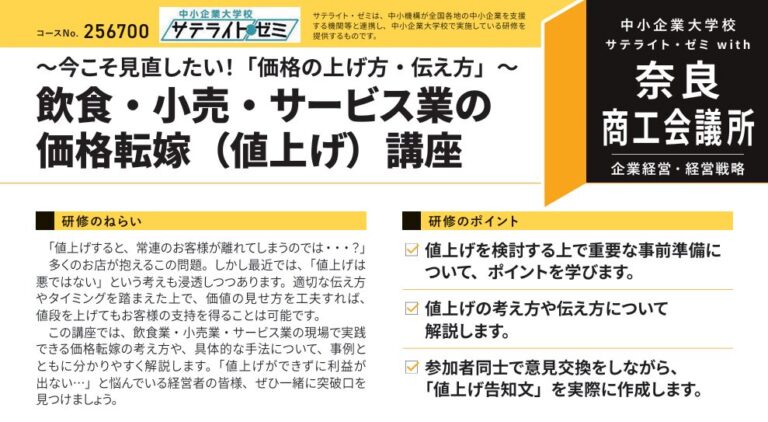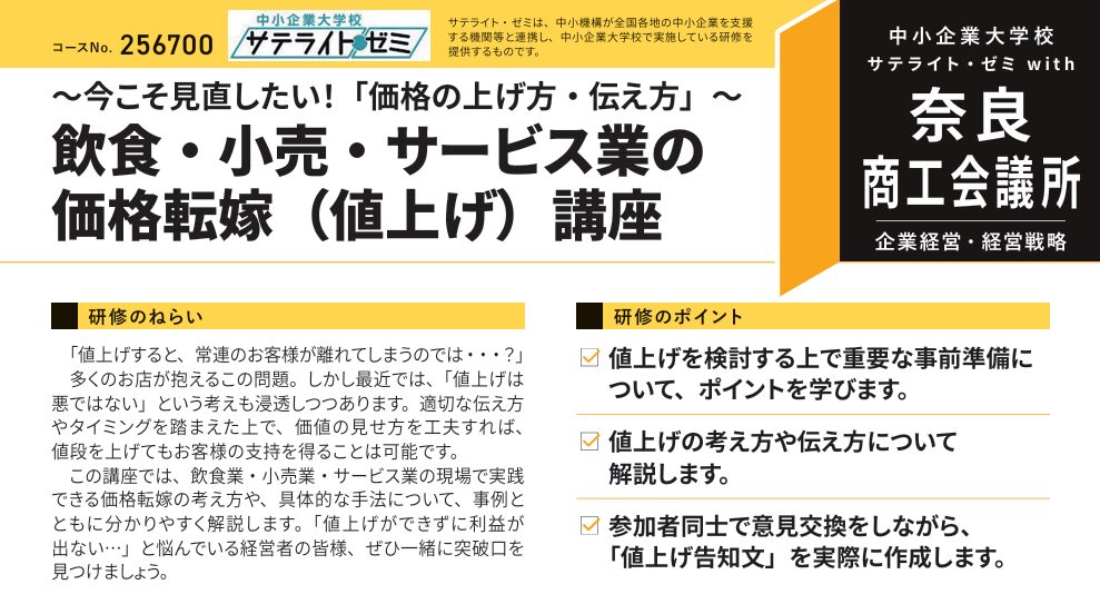 飲食・小売・サービス業の価格転嫁(値上げ)講座(サテライト・ゼミwith奈良商工会議所)のご案内